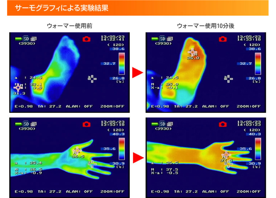 使用後 - 手腳溫度較高 (測試黃紅色區域較多)