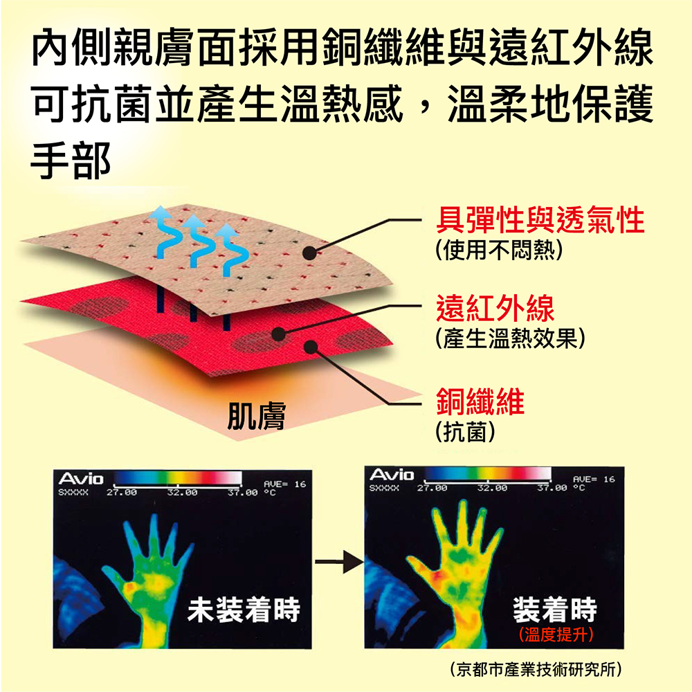 2. 內側親膚面採用銅纖維與遠紅外線,可抗菌並有溫熱感。