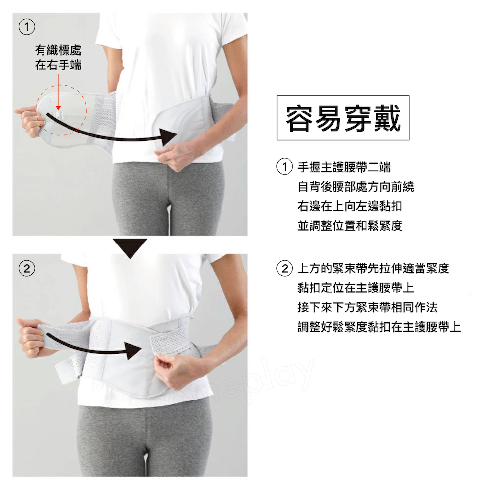 ● 左右手各執護腰一端(右手執有 ALPHAX 品牌織標端),從背部往前繞