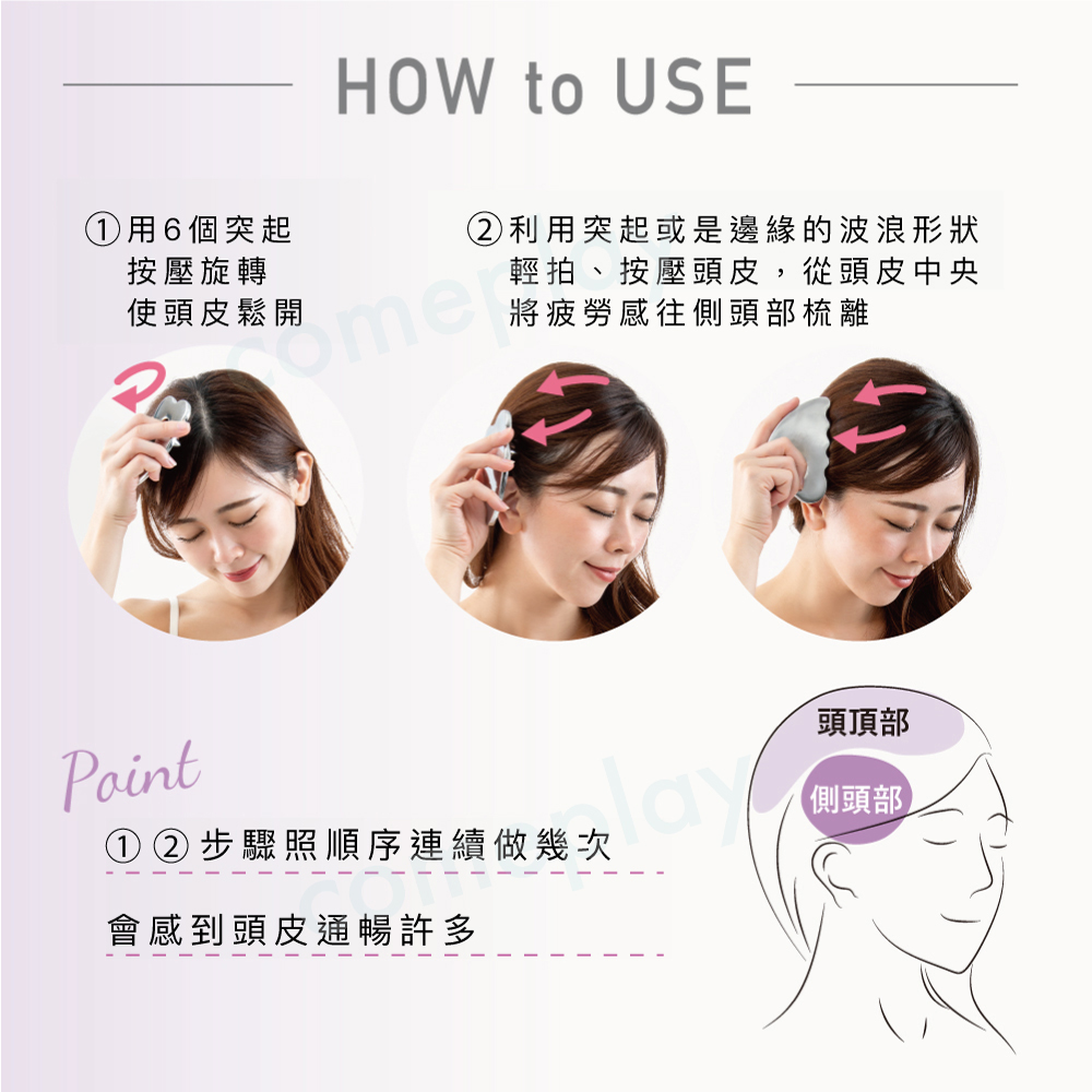 ● 用突起部分或波浪形部分輕胺頭皮,將頭皮上的堆積順開。