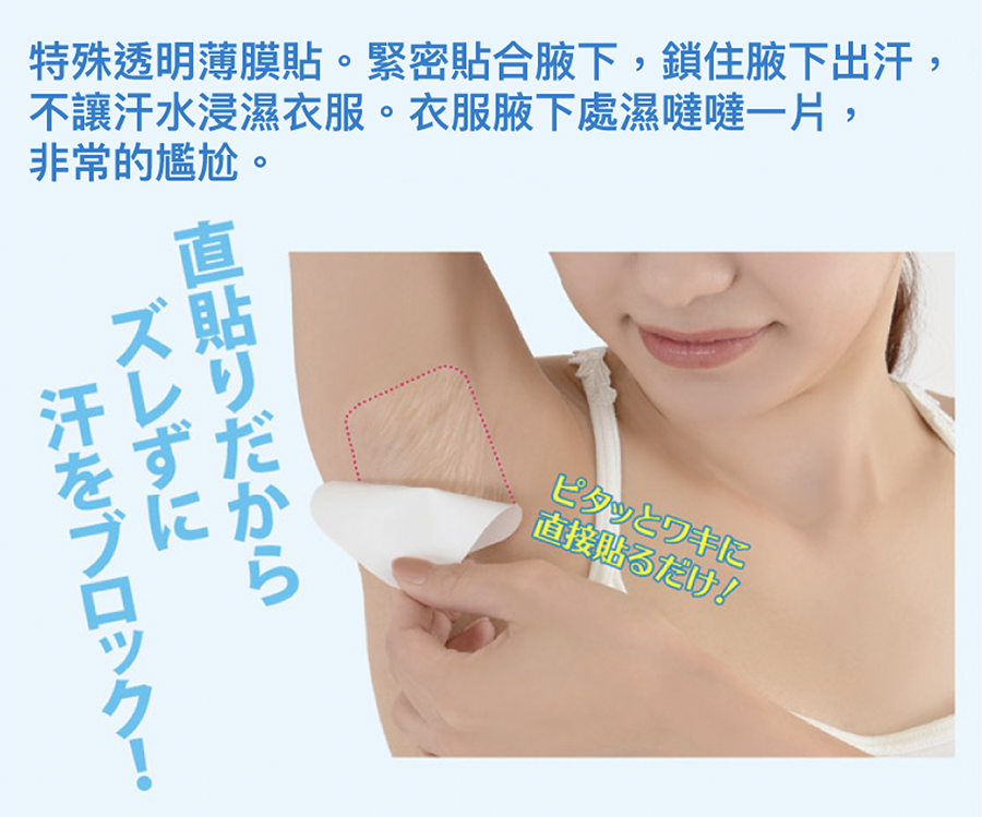 ● 貼在腋下,避免腋下出汗沁滲至 T-shirt 或襯衫上,造成腋下濕噠噠一片,很不美觀!